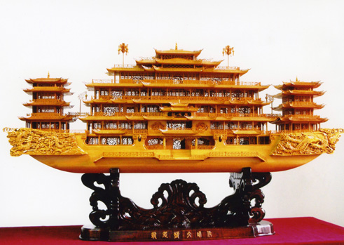 特征:湖北木雕船除使用圆雕、浮雕、镂雕等传统技法外,还特别注重花纹装饰、镂空锼花和精工制模,不仅船体花纹清晰、匀称纤细,而且楼阁门窗、栏杆等处的花纹也处理得精细入微。