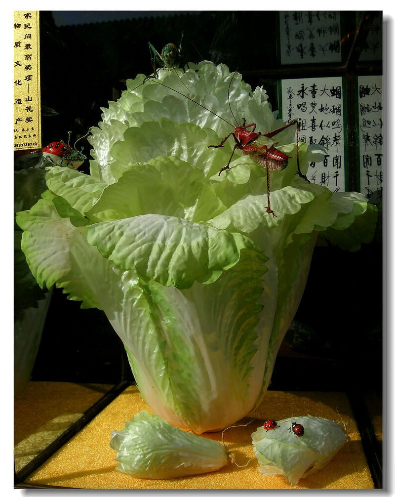 此时,不由让人想到了“栩栩如生”一词,或者“栩栩如生”也不能完全表达亲眼目睹秦氏绢艺的这些绢蝈蝈的感受。      绢艺使用的绢非常讲究,大缎子、平缎子、绉缎、绫子、纺绸、乔其纱、洋纺......不同的绢使用起来效果也绝对不同。一只绢蝈蝈通常由6种绢制成,须、头部、身体、翅膀、腿、鳞片材质各不相同。其制作工艺复杂自无法细说。单是须,便有40道工序。它抽自雪白的绢丝,最终却形成由粗渐细、带有绒毛的赫色硬须。且不同的蝈蝈其胡须并不相同,有觅食的、备战的、喝水的、休息的,构成一只蝈蝈极好的状态写照。再看白菜,色彩鲜艳,层次分明,白菜的每片叶都严实地裹到一起,就连白菜的根和须也都做的相当逼真。虽然白菜做起来工序比蝈蝈少,只有48道工序,但白菜也同样是用绢,经过一系列的流程做出的。就这样!经过艺术家的妙手匠心, 两只蝈蝈趴在一棵大白菜身上,就变成了秦氏绢艺的代表作“蝈蝈白菜”。另外, 秦三杰家中展厅内摆放的还有《螳螂捕蝉》《竹林之声》《国泰百财》《秋韵》等作品.作品中的人物、鸟类、植物、草虫件件栩栩如生,活灵活现均能以假乱真。