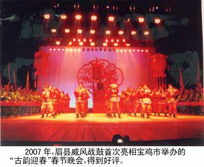 战鼓社从1990年由第五代传人荔改朝组织发起,购衣制器,译谱教徒,每逢古历节日,百姓以鼓作乐,自娱自乐,进入21世纪后,鼓社边向外地推介,边添置器具,后经县乡领导重视支持,人员不断扩大,学员逐步增加,曾先后在西安、宝鸡、太白、扶风、周至、杨凌等地表演,并获得宝鸡市2002年民间锣鼓大赛第一名。2006年中央文化部、财政部、省文化厅、财政厅,市文化局、财政局多家媒体采访调研,受到领导赞誉和鼓励支持,而且拨出专项资金2万元,要求壮大保护。2007年陕西省副省长李堂堂及省文化厅厅长、市副市长冯月菊,文化局副局长杨茂生及县委书记王琳、县长张乃卫亲临现场观看威风战鼓表演,调研农村文化,李副省长特别高兴鼓励指导搞好农村文化生活,副市长也特别鼓励荔改朝同志要搞下去,为宝鸡人争光。2007年,省文化厅厅长秦天行及蒋惠莉副厅长,市文化局副局长杨茂生,各县市主管文化事业领导现场观看。2007年宝鸡市“古韵迎春”晚会,由市县专业人员指导,威风战鼓搬上舞台,走进银幕,形成了规模较大颇具影响的文化产业。