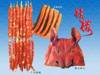 桂楼腌腊品现有广味香肠、川味香肠、川味腊肉、京酱风肉、蝶式猪头、以及腊香猪耳、猪舌、猪拱嘴、猪排、猪心、猪尾、猪蹄和香茶板鸭、香茶板兔等30多个单品。其各种单品及组合、包装形式可满足消费者多层次的需要。