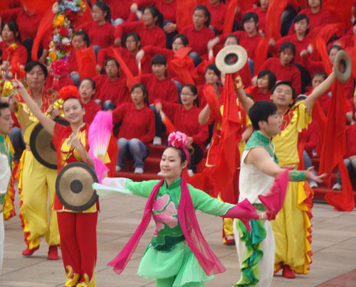 跑旱船,跑时,表演者中有一名“艄公”划桨引船,在前头带路,做出各种各样的划船动作。而乘船者在表演中,往往是走快速碎步,这样能使船身保持平稳的状态前进,犹如在水面上漂动的船那样,颇为形象地塑造出水面行船的情景。乘船者不止一只船,三、五成群,一线儿排开,与“船公”默契配合,时起时伏,随着“波浪”旋转、颠簸,犹如是水上跑船时的生动画卷。
