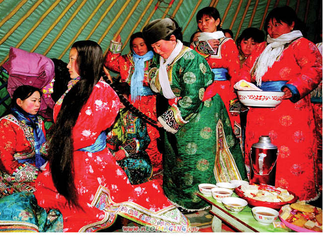 蒙古勒津婚礼始于元代,距今已有700年的历史,是一种民间婚礼形式。提亲一般由男方长辈带上白酒等礼品去女方家中求婚。订婚时,男方带上自制的奶酒、一只熟羊和其他礼品,到女方家,先敬哈达,再致订婚词。婚前,男方还要给女方送过礼(即聘礼),婚礼上,除宴饮、歌舞外,安排一些诙谐有趣的角力游戏。有“接亲、迎亲、送亲”三大部分总计17个程序。