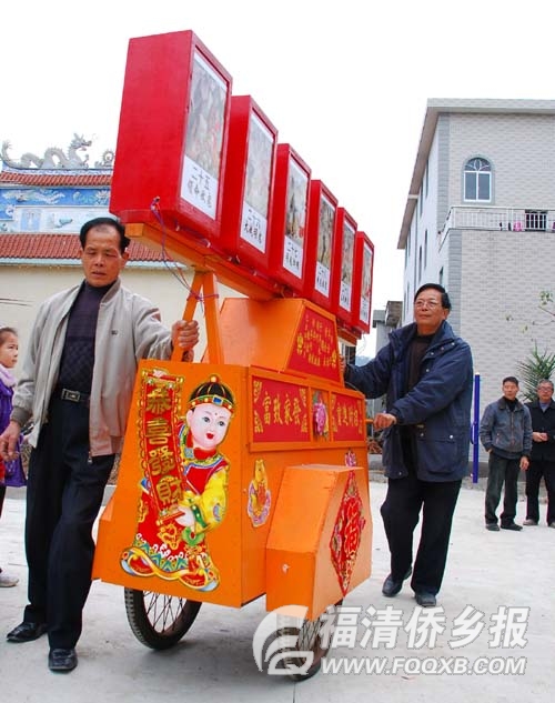 1985 年沧州市郊区梁官屯祁功利老人奉献失传已久的民间文艺推灯制作之绝技,以庆盛世。推灯,源于古丑婆拉碌碡,以取笑。后研制成拉灯,又推灯。它由木杆、木把、木齿轮结构而成。园灯横卧,瓶灯相立,一人推拉,齿轮相咬,车移灯转。 1986 年改革推灯,加电瓶装轴承,与木结构制约,卧纱灯竖绢瓶,层层有别。稍推动转不停。推灯前后配以身着彩衣彩带的舞男舞女,在古乐声中翩翩起舞。
