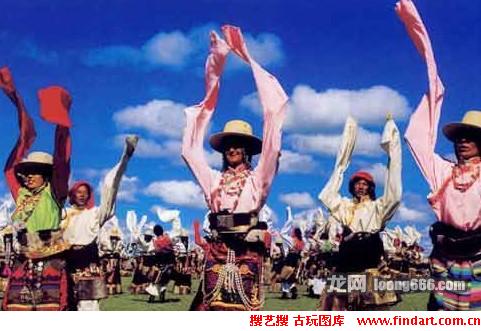 迪庆藏族锅庄舞,广泛分布在云南迪庆藏族自治州,根据从丽江石鼓轿子村出土的唐代藏文画像碑中的舞蹈形象推测,锅庄舞已有上千年的历史。