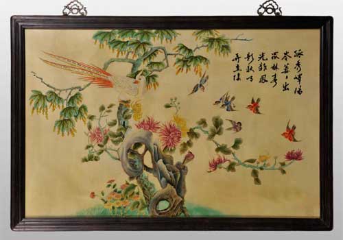 简介:扬州刺绣:扬州刺绣与苏州刺绣的技艺虽属于同一门类,但由于受扬州历代文化的影响和扬州八怪画派的熏陶,追随中国画的文化内涵和笔墨情趣,“仿古山水绣”和“水墨写意绣”逐步形成扬州刺绣的两大特色。扬州刺绣源于汉代,兴于唐宋,盛于明清,至今已有两千年的历史。早在西汉之初,汉高祖刘邦封其侄刘濞为吴王,王宫里的墙壁上就挂有华丽的扬州绣品。唐代,扬州是国内外著名的经济都会,手工业繁盛,刺绣业已很发达。宋代是扬州刺绣的重要转折时期,即从唐代的绣佛像转向绣书画,从实用性向观赏性发展。所绣物品针线细密、色彩美妙,富于生活情趣。当时的文人墨客倡导琴棋书画,寄情花鸟鱼虫,对扬州的人文艺术以致审美情趣的转移产生很大的推动作用。扬州刺绣受其影响,以此为题材的绣品逐渐增多,出现了为人称颂的双面绣。明代刺绣业,由于朝廷官府的倡导而得到进一步发展。扬州刺绣的特色是作品多取自于历代诸多名家的优秀山水、人物画作,意境深邃,构图层次清晰,色彩雅致柔和。每件作品针法缜密、艳丽、工整、光洁。绣师们以精湛的技艺极力表现我国写意画潇洒传神的笔墨神韵和工笔画的精致严谨。
