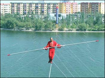 当今表演达瓦孜的明星当数新疆杂技团的空中王子阿迪力•吾守尔,他是达瓦孜表演世家的第6代传人,其家族表演此技至少已有四百多年的历史。阿迪力•吾守尔不但创造了在高空钢丝上小顶倒立、劈叉、骑独轮车、弯腰采莲等创新性的高难技巧,而且于1997年和2000年两次刷新了高空走钢丝的吉尼斯记录,成为众人关爱的空中勇士。