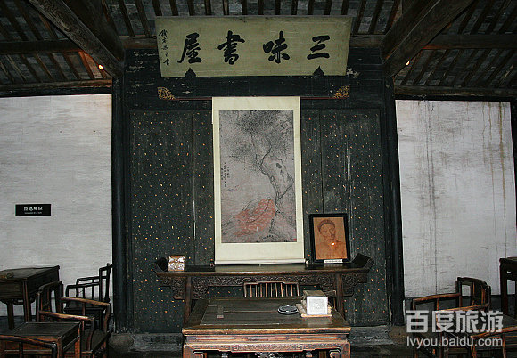 匾额下方是一张松鹿图,两旁屋柱上有“至乐无声唯孝弟,大囊有味是诗书” 一幅抱对,匾中抱对皆为清代书法家梁同书的手笔。鲁迅的座位在书房的东北角,这张硬木书桌是鲁迅使用过的原物。
