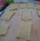 原料:白面、脱破芝麻、食油、盐。 作法:将白面放入瓷盔中,取盐少许用凉水化开倒入面内,加水搅拌,揉和均匀,面团要较硬,放案板上擀成一指厚大片,倒上食用油手抹均匀,上撒白面,搓成小酥氆氇,再卷成长条,攥成拳头粗棒条,俩人对拽扯成直径5公分的长条,置案上手截成段,逐段擀成长片,两头回折,翻扣再擀长,两头对折成四角方形,摆齐洒水,以手在上抹成糊状,均匀地撒上脱皮芝麻,翻扣过去,手拍背面使芝麻长牢,用一小块面试擦生有炭火的的炉壁,看面皮呈黄色即装炉加盖,十分钟左右即熟。 ) 特点:四角方形,鼓胀焦黄,层层皮薄,酥脆清香。 城府千层四方方,芝麻万点心计长。 奈何八挂炉中烧,纵到唇边更放香。