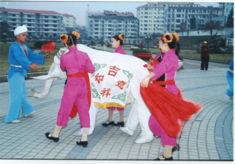 大象成为战象,这在将战争与祭祀视为国之大事的春秋战国时期,其必定会受到人们的尊崇和喜爱。由此可以想象,当时的人们对大象是何等的尊崇和喜爱了,他们在一定的场合下模仿大象的姿态,表现大象的雄状和憨态可掬,与大象在一起表演娱乐,应是顺理成章的事。至于这种娱乐表演是如何流入民间,成为广场艺术,虽然没有确切的记载,也无据可考。但我们推测可能是因“象”与“祥”谐音,“象”便成为人们日常生活中崇拜的“吉祥”之物,它寄托着人们对“吉祥如意”的日子的向往和追求。因此,跳象舞便是人们对这种向往和追求的真实情感的流露。