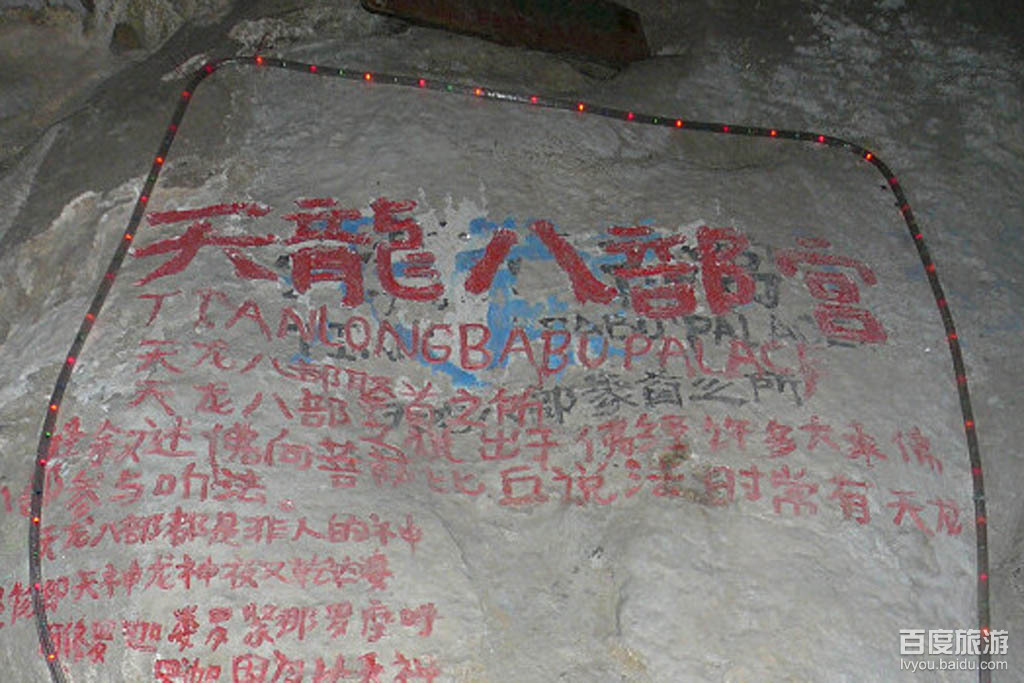 天龙洞座西向东,洞口开阔,游路曲折,总长150多米,进入天龙洞入口不远处,有一穹形厅堂,钟乳、石笋倒竖横伸,中有一巨龙张牙舞爪,似在形态各异的奇石中游动。沿游路攀登,移步换景,有“石海、洞乡”、“仙客绣球”、“犀牛望月”、“天龙八部宫”等,其造型栩栩如生,令人目不暇给。天龙洞出口在陡峭的岩壁上,一出洞口,豁然开朗,让人有恍如隔世之感。出得洞来,返程途中修建有亭、阁、游廊,可供游人休息。从山上向东眺望,山脚下的洱海风光尽收眼底,令人心旷神怡,不禁陶醉于大理如画的美景之中,流连忘返。