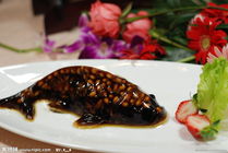 金饼就是我们常说的玉米饼,与焖得酥烂的鲈鱼搭配在一起。鲈鱼虽然是采用焖的烹调方法,但肉质并没有因为烹调方法的原因而丧失其应有的鲜嫩特点。其口味浓香酥烂,鲜香适口,搭配金黄酥脆的玉米饼,口味十分浓郁。其特点:色泽红亮、滑嫩鲜美、回味无穷。