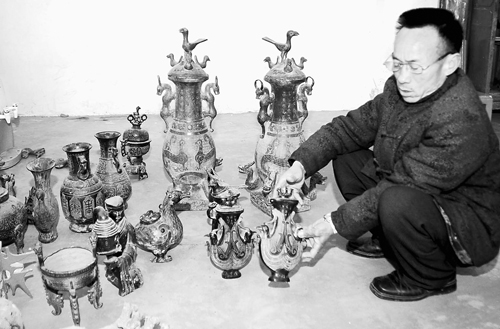 柘城仿古艺人孟昭生自1980年涉足仿古工艺领域以来,其仿古工艺品逐渐形成了青铜、玉雕、石雕3大系列、260多个品种,仿古类作品有相当出名的“马踏飞燕”、“四羊方尊”、“古方鼎”、“西周圆鼎”、“和氏璧”、“金镂玉衣”、“铜车马”、“九龙玉杯”、“杯满自停壶”、“美人杯”等。