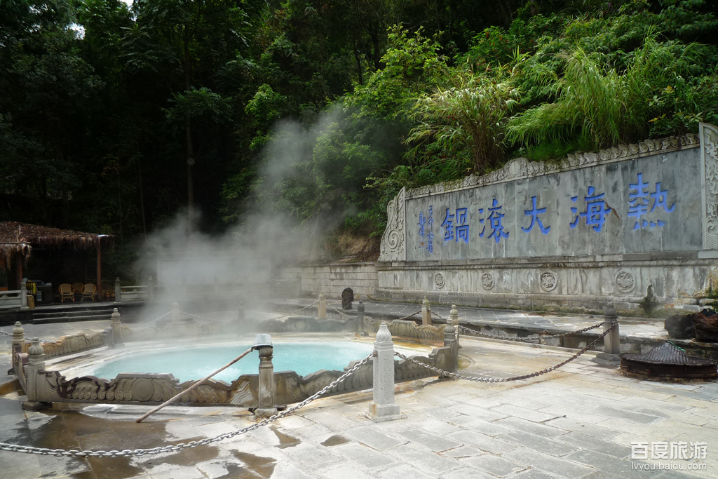 腾冲热海景区到处都可以看到热泉在呼呼喷涌。世界上有温泉的地方很多,但像腾冲热海这样面积之广、泉眼之多、疗效之好,实属罕见。热海中最典型的是“大滚锅”,它的直径3米多,水深1.5米,水温达97℃,昼夜翻滚沸腾,四季热气蒸腾。据说从前有一头牛到大滚锅边舔吃带咸味的泉水,不小心掉入锅内,待牧童从村里喊人来时,已煮成一锅牛肉。
