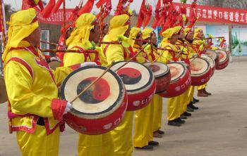 简介:距离古鸿门遗址不远处的西安市临潼区新丰街办长条村里,失传多年的“十面锣鼓”古调,在现年已70岁的金炳文(右三)老先生的传授下,又重新敲响了。村民们用这种方式庆祝村里的“长条十面锣鼓古调搜集委员会”成立一周年。
