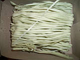 绿豆、小麦、芝麻磨成细粉,用香油、白糖、蛋清和适量的水和成面团,饧置。将饧好的面团擀成薄纸一样的大面片,略凉至不干不湿,折不断,卷不沾时,叠起切细丝。色黄透明,形如金丝,存放期长,耐煮不烂,清香爽口。