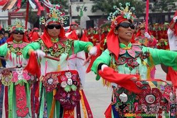 简介:“花苫鼓”流传于渭南地区大荔县石糟乡九龙村,是一种少见的由女子(过去是男扮女装)击鼓、男子伴奏的民间舞蹈。表演时,鼓手腹前挂一个扁圆小鼓(鼓的直径约35厘米左右),并用一块长约70厘米、宽约50厘米的彩花绸缎做鼓围子,围遮鼓帮,垂于鼓下,当地俗称“鼓苫子”,“苫”,当地方言,指用物遮盖的意思。花苫鼓由于鼓手扮相俊秀、服饰华丽,群众又称其为“花鼓”、“花社火”。