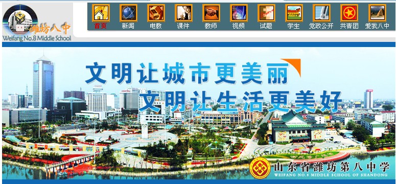 潍坊八中(6张)潍坊八中立足诚信、方圆与人文,凭借先进的办学理念、独具特色的“养成教育”和一流的教育教学质量,实现了学校全面、和谐、可持续发展,成为潍坊城区办学的一面旗帜。
