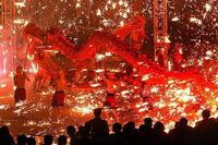 简介:铜梁火龙源于铁炉业的行业龙,古往今来最受人们喜爱。火龙每条长20米,由11人玩舞。火龙舞通常是两条火龙相配合,外加吹打乐队、干花队、铁水花队以及喷花、烟火、火流星等助阵,整个火龙队40余人参舞。火花与火紧密相连,无火就不成其为火龙,舞龙者赤身亮体,身着短裤衩,两条火龙表演时或分或合,或翻或腾,表演于铁水花与干花施放中,给人的感觉是又惊又怕又刺激,是极品的观赏节目,铜梁火龙也是近年来各地应邀参加表演的首选节目。火龙表演至少需要100平米见方的场地,且周围无任何易燃易爆物品。