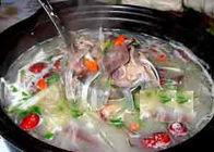 特色:羊杂汤里面掺些山药粉条,有荤有素,油而不腻,质醇味美,捞出锅来热气腾腾,香气袭人,吃起来味道鲜美,具有明显的驱寒、暖胃、舒身等功能,是一味较好的食疗保健食品。凡是外地人来到大同以后,必须品尝一碗又辣又香的羊杂粉汤,方不虚此行。