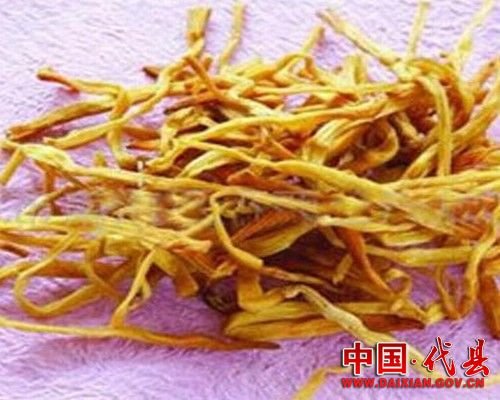 简介: 代县金针,又名黄花菜,其色泽金黄,角长肉厚,硕大肥嫩,个头均匀,烹调久煮有烂,吃后余香不绝。金针营养丰富,据科学化验结果,每百克干品中,碳水化合物含量高达60.1克、蛋白质14.1克、灰分0.9克、钙436毫克、磷261克、铁24.3毫克。