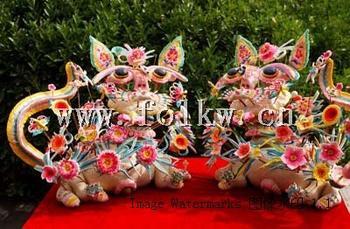 简介:面花,也叫“礼馍”、“花花馍”,相传是由古代金石礼品和图腾演化的产物。每当民间四时八节,生婚寿葬,民间农妇用白面,以针线、梳子、剪刀为工具,靠巧手揉捏出花、鸟、虫、鱼、猪、狗、鸡、鳖、蝙蝠、青蛙、人物、建筑物等千姿百态的一种民间塑艺,造形拙扑,意态纷呈,栩栩如生。尤以虎的造型最佳,令人乐见。大凡若需送喜庆、节日、祭祀多种规格的礼馍,以表达他们的喜、怒、哀、乐,人生信仰。故内涵丰富,喜闻乐见。八鱼乡阿寿村面花艺人一代接一代,青出于兰胜于兰。1990年代初,王玉侠等人的作品曾参加陕西省首届“西御杯”面花大奖赛。《古寺佛殿》晋京参展,荣获大奖。1990年代后期,马勤叶、张月香等巧妇创作的《药王庙》面花,气势恢宏,古朴趣拙。是其按药王庙建筑形状,逐件生捏熟蒸,后组装成一体,对庙门的戏楼、庙门楼、庙门两侧铁旗杆、牌楼、石狮、前后殿、万人伞、两侧龙虎震守的药王洞(寝室)等十余种,占面积约2.5平方米,其中戏楼、前后殿均高50厘米,宽40厘米,气势宏伟磅礴。特别是庙门、牌楼外饰雕梁画 栋,古态雄风,雀跃屋脊,燕翔楼端,体姿舒闲,栩栩传神,再赏那石狮石虎,火眼金睛,威态飚炳,严阵洞口,他人难入,颇具大西北狂风卷沙之势态。