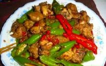 2、锅里烧油至7层热,倒入姜蒜炒出香味后倒入干辣椒和花椒,翻炒至气味开始呛鼻,油变黄后倒入炸好的鸡块,炒至鸡块均匀地分布在辣椒中后撒入葱段,味精,白糖,熟芝麻,炒匀后起锅即可。