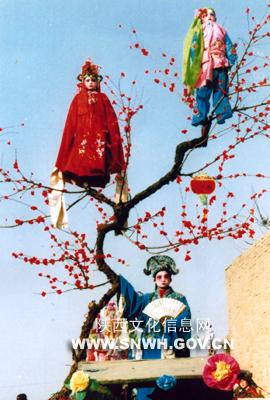掮社火是把孩子扮成戏剧人物,直接站在大人肩上跑动表演的社火形式。这一形式现在主要保留于凿齿村的社火表演中。