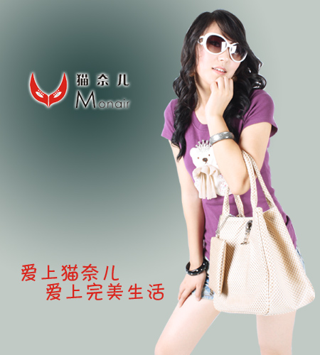 本公司推出的时尚品牌Maonair(猫奈儿),款式新颖,样式齐全的各类时尚新潮女包,手袋,设计风格独特、前卫,设计师们通过自然的色彩运用,将时尚的流行元素,柔美的线条,休闲的情调,有机的融合在一起。从而将时尚与生活完美的结合,使其产品卓而不凡,脱颖而出。其产品以其造型优美,工艺精湛,畅销全国各地