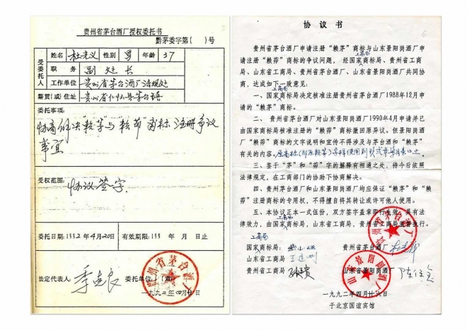 经国家工商局、山东省工商局、贵州省工商局、茅台酒厂、景阳冈酒厂五方协商:茅台酒厂用赖茅商标、景阳冈酒厂用赖茆商标,同音同义不同形(有时任茅台酒厂厂长季克良先生的签字及茅台酒厂的公章)