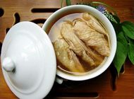 盐水鸡是四时咸宜的食品,夏天宜吃“酒醉鸡”,冬天宜吃“糟鸡”,春天色味全好的要属“鸡丝巧冻”。做法是当年大鸡一只,煺尽洗净,加猪爪尖一个,用盐水料酒煨烂,捞出,猪爪尖不要,将鸡汤淀清,澄去渣滓,倾入大盆盘中,然后把鸡脯嫩肉撕成细丝,撒放汤内,但鸡肉不可太多,以免影响美观。鸡冻呈绍兴酒色,如透明黄玉,如带花纹的琥珀。更将香菜掐成寸叶,摆在冻上。吃时用刀将冻划切为骨牌块,盛于白盘之内,色美味佳,是春天小酌的妙品。