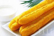 简介:一、原料1、主料:面粉5000克(标准粉)。 2、辅米:盐65克,明矾50克,小苏打60克,水3000克,花生油7500克。 二、制法1、将盐、明矾倒入面盆内,放入3000克的水,用手搅拌待,明矾、盐全部溶化没有颗粒时,再放入小苏打拌两下,再将面粉倒入水里搅匀,然后单手揉搓,待整块面团揉至表面光滑有弹性时止。分成两块,揉成团,上面用潮布盖好。 2、放入盆中,饧面1小时后再团好,盖上潮布,放约1小时,中间两次用手将面团从边沿往中间接叠(手沾水,冷天时间要长一些,要随着气温的变化改变饧面时间)。 3、饧好的面用手拉成长条,用小刀切成每条约厚0.7厘米、宽2.5厘米、长12厘米的小长条,厚薄要均匀。 4、锅置旺火上,下油烧至八成热。 5、把两个小长条叠在一起,两头要叠齐,中间用小木棍压一下,然后拉至25厘米长,沿着锅边旋转2~3圈,轻轻晃动下油锅内,拨油条时要轻、稳(以油不晃为好)。用筷子轻轻钳住油条,每根油条翻身四五次,待油条胀发,呈金黄色时捞起,沥干油即成。  特点:香脆可口。