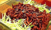 简介:京酱肉丝是传统北京风味菜。选用猪里脊肉为主料,辅以北京\"六必居\"特产黄酱及其它调味品,用北方特有烹调技法\"六爆\"之一的\"酱爆\"烹制而成。特点咸甜适中,酱香浓郁,风味独特。