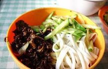 简介: 炸酱面是北京有特色的食物,也称为杂酱面,由菜码、炸酱拌面条而成。将黄瓜、香椿、豆芽、青豆、黄豆切好或煮好,做成菜码备用。然后做炸酱,将肉丁及葱姜等放在油里炒,再加入黄豆制作的黄酱或甜面酱炸炒,即成炸酱。面条煮熟后,捞出,烧上炸酱,拌以菜码,即成炸酱面。也有面条捞出后用凉水浸洗再加炸酱、菜码的,称“过水面”或者“凉面”。