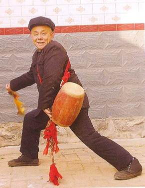 2、花鼓:样式同腰鼓相同,两个鼓面用牛皮所蒙,鼓面的直径为15厘米,鼓棒是由木料制作的,颜色为大红,鼓长30厘米,此鼓系有一条红绸带,以便背在肩上。花鞭鼓使用一般腰鼓, 用小锣小镲伴奏。 舞者头系白毛巾, 身着短衣, 斜挎腰鼓与左胁下, 双手各持一鞭, 鞭杆长22厘米, 鞭条长50厘米, 鞭梢系成疙瘩。 表演时击鼓方式奇特, 两条鞭上下翻飞, 甩至背后, 胸前, 胯下准确地击打鼓面, 鞭飞鼓鸣, 独具一格, 引人入胜, 艺术效果非常强烈。有前八步, 后八步, 鹞子翻身, 鲤鱼跳龙门, 古树盘根, 张飞骗马, 苏秦背剑, 二龙吐须, 金丝葫芦, 菊花盖顶, 黑狗钻裆, 就地十八滚等30 余种。
