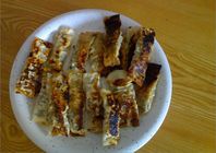 特点:它是一种油煎食品,色泽金黄,焦香四溢,鲜美可口。有些人吃韭菜易反胃,但做馅时又喜食韭菜的味道。因此用韭菜的中段儿包在类似锅贴的褡裢火烧里,煎熟后把韭菜抽出食用。这样既得到了韭菜的香味,又不会导致反胃。