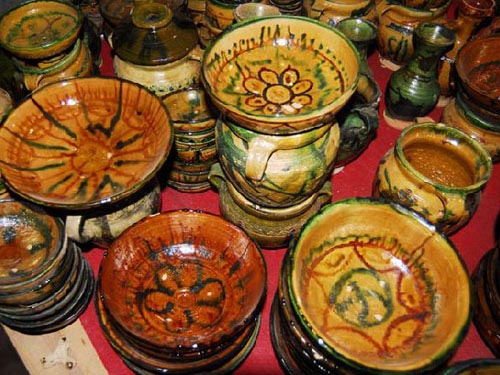 维吾尔族土陶器中还有大量的壶型器物,都用彩釉装饰得五彩缤纷。在造型上,各类缸与汉族地区的缸造型相似.而罐和餐具则形式多样,与内地同类器皿相比,维吾尔族的陶器普遍夸张。独特的造型主要体现在各种壶上,具有鲜明的阿拉伯风格。形制、色彩、造型如此丰富,说明了维吾尔族制作土陶器的技艺比较成熟,且自成一家。
