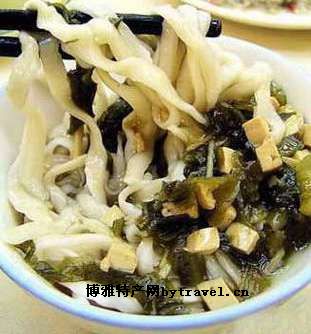 现在就可以说拨面了——用白荞面做的面条。为什么叫拨面呢?这是指它的做法。将白荞面分成四等份,先用滚烫的开水将其中一份烫熟,然后将其他三份用凉水打湿,一点点搋在熟面上,最后和成面团。停放10分钟,使其软硬合适,即置于案板,擀成宽不及尺、厚达3分的面饼。现在开始拨面了,厨师双手抓住两边带把的面刀,一刀一刀迅速而匀称地将面饼截成细丝。随着拨刀的移动,面饼逐渐缩小,而面丝却在后面整齐地排列出来。最后,将面丝下入翻花的开水锅。少顷捞出,盛进饭碗,加上菜码或卤子,即可上桌。只见拨面细如挂面,棱角分明。其颜色“洁白如玉,赛雪欺霜”(乾隆语),食之,则爽利脆口,淡香绵长。
