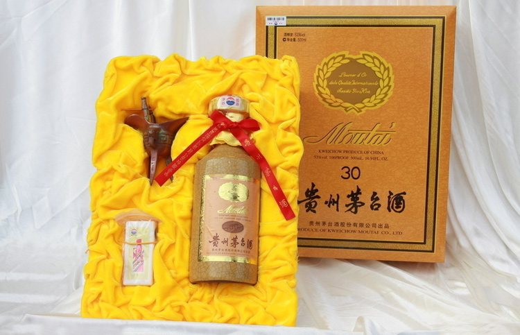茅台三十年采用了紫砂瓶来作盛酒的包装,外包装的卡盒也是简约、典雅、大方,茅台的名声在外,陈年三十年的酒更是香气扑鼻,因此他的稀少珍贵也就成为了商务礼品中的最佳礼品酒。