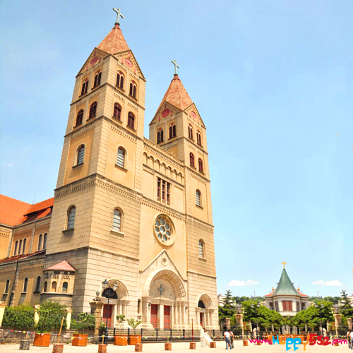 简介:青岛天主教堂本名圣弥厄尔教堂,由德国设计师毕娄哈依据哥德式和罗马式建筑风格而设计。拟建教堂应高百米,适逢二战爆发,希特勒严禁德国本土资金外流,该教堂不得不修改图纸,即建成现在规模。教堂始建于1932年,于1934年竣工。占地面积11480平方米,其中建筑面积6301.54平方米。教堂以黄色花岗岩和钢筋混凝土砌成,表面雕以简洁优美的纹案。窗户为半圆拱形,线条流畅,显得庄重而朴素。大门上方设一巨大玫瑰窗,两侧各耸立一座钟塔,塔身高56米,红瓦覆盖的锥形塔尖上各竖立一个4.5米高的巨大十字架,塔内悬有四口大钟,一但钟乐鸣奏,声传数里之外。进入教堂,是一个高达18米,可容千人的宽敞明亮的大厅,色彩斑斓的玻璃花窗透射出柔和的光线。大厅东西两侧设有走廊,后面设有两个大祭台,四个小祭台,厅的穹顶绘以圣象壁画,灯光炫目,充满浓厚的宗教气氛。屋顶覆盖舌头红瓦,其气势庞大,且又古朴典雅。教堂装饰系采用意大利文艺复兴时期形式。堂内大厅高18米,宽敞明亮,顶棚悬有七个大吊灯,后方设有祭台,配之穹顶的圣像壁画,堪称庄严美观。可容纳教徒千人,是青岛地区最大的哥特式建筑,也是中国唯一的祝圣教堂,同时也是基督教建筑艺术的杰作。文革时,教堂受到严重破坏,1981年4月恢复使用,列为省级重点文物保护单位。