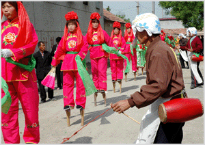 “寸子”是一种木制道具,30厘米左右,寸子底部套着绣花小鞋,表演者踩在寸子上走动时,宽而长的裤腿可以盖住寸子的木柱。有一种若隐若现、风姿绰约的视觉效果。