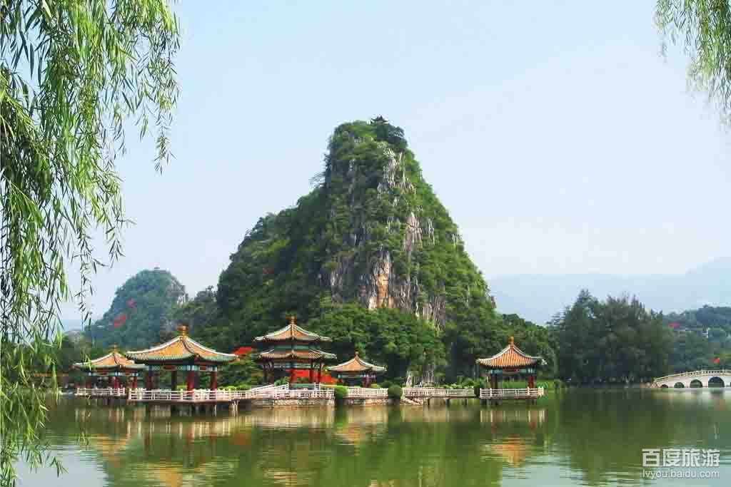 简介:七星岩景区由五湖、六岗、七岩、八洞组成。湖中有山,山中有洞,洞中有河,景在城中不见城,美如人间仙景。七星岩以喀斯特溶岩地貌的岩峰、湖泊景观为主要特色,有七座排列如北斗七星的石灰岩岩峰巧布在湖面上,湖堤把湖面分割成五大湖,风光旖旎,所以取名为七星岩。20多公里长的林荫湖堤,如绿色带飘般把仙女湖、中心湖、波海湖、青莲湖和里湖连结在一起,湖光山色,绰约多姿。被誉为\"人间仙境\"、\"岭南第一奇观\"。