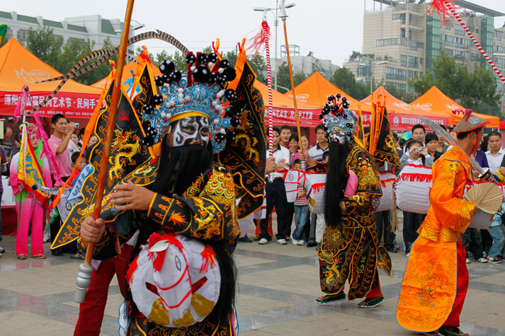 简介:流行于闽西龙岩适中、闽南南靖等地。竹马灯元代传入福建,成为传统艺术形式之一,千百年来,一直为群众所喜爱,龙岩适中竹马灯从人物脸谱、舞蹈动作及队形变化上看,属于表现丰收喜庆迎宾的欢乐场面。全队共十人十骑,两个小生,一个扮书生手扶扇,另一个执令旗,各骑红马;两个小丑,项童打扮,各骑白马;其余三对扮村姑和青年,各骑黄马。四盏四角灯,两幅城墙城门布条。由骑红马小生领头,在广场作流动性表演各种队形变化的舞蹈,乐曲有《五更响》、《补缸歌》、《卖杂细》等。闽南竹马灯则多表演《昭君和番》的故事,表演者脸谱各异,服饰有别,出场时有番兵头、小丑、小生刘状元、番王等,有的还加毛延寿,也是十人十骑。