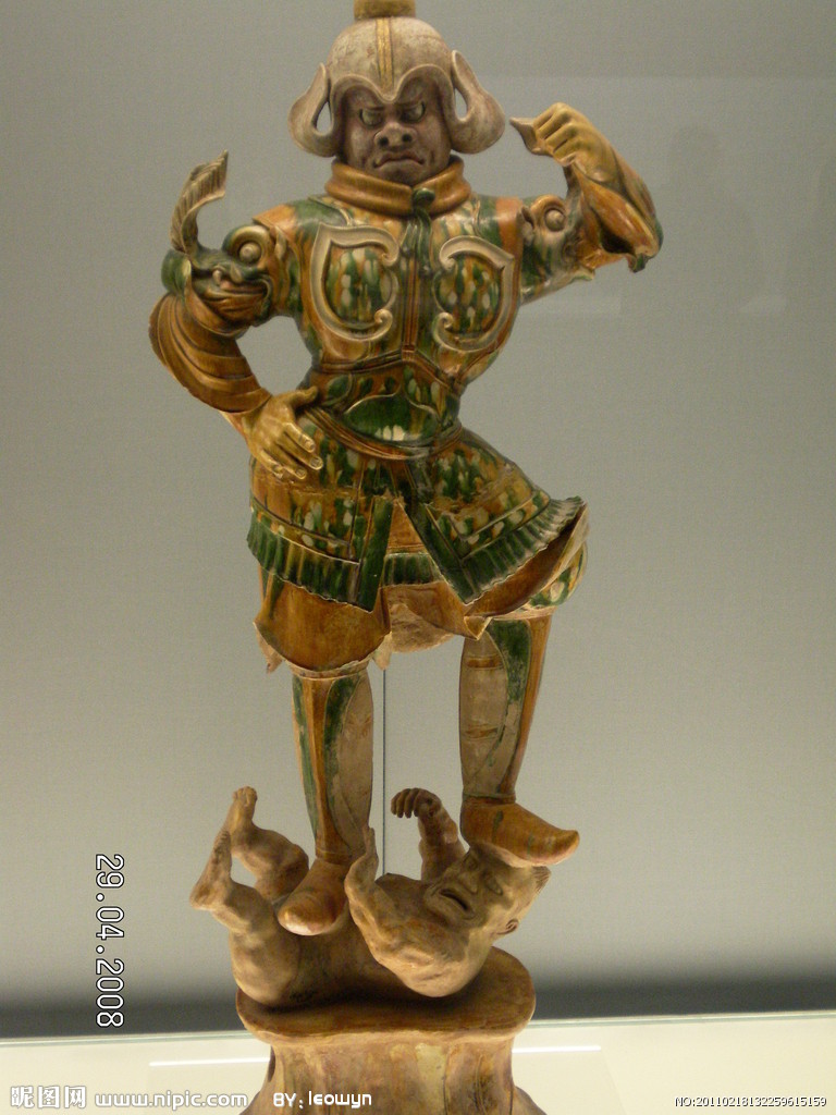 唐代是我国封建朝代的鼎盛时期,所以说唐三彩从另外一个侧面也反映了这种唐王朝的政治、文化、生活,它跟唐代诗歌、绘画、建筑其他文化一样,共同形成了唐王朝文化的旋律,但是它又不同于其他的文化艺术,从现代的陶瓷史上认为,唐三彩在唐代陶瓷史上是一个划时代的里程碑,因为在唐以前,只有单色釉,最多就是两色釉的并用,在我国的汉代,已经有了两色,就是黄色和绿色的两种釉彩在同一器物上的使用。那么到了唐代以后,就是说这种多彩的釉色在陶瓷器物上同时得到了运用。有的就是从陶瓷史上有人考证讲,这和唐代当时的审美观点起了很大的变化有关系。在唐以前人们崇尚的是素色主义吧,到唐代以后,它包容了各种文化,包容了外来的好多文化,那么就是说这个时候从绘画也好,从陶瓷也好,从金银器的制作也好,它形成了一个灿烂文化的这么一个特点。