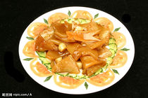 简介: 红烧裙边是唐山一道具有代表性的菜肴。其特点是软滑味,汤浓味鲜,裙边嫩糯。制作时将新鲜鼋裙边改刀切成长方块,用开水氽透,捞出;火腿切成长方块,油菜心开水氽透。锅内加入鸡汤和裙边,火腿片放在上面,再下入葱、姜等调料,先用大火烧开,然后用小火煨。待裙边烂后,挑出葱、姜,兑好口味,用水淀粉勾薄芡,浇上鸡油,盛入盘内。最后锅内加入鸡汤,上火烧开,加入盐、芝麻油、胡椒面,放入菜心,把菜心烧酥后,捞出,围在裙边的周围,撒上芝麻,即可。