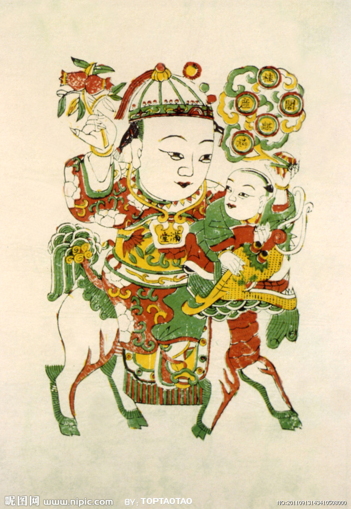 民间年画:民间年画也画仙女抱一男孩骑于麒麟背上,谓「天仙送子」。麒麟与玉书、如意组成图案谓「麒麟祥瑞」、「麒麟如意」。中国传统吉祥图案之十七:麒麟送子