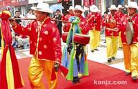 简介:挑担围鼓\"为湖北省第一批省级非物质文化遗产。\"挑担围鼓\"俗称\"挑鼓架子\"\"打踩街\",是可以行进演奏的一种民间吹打乐演奏形式。先秦时期,古楚乐盛行,已八音俱备,凡重大庆典、祭祀、宴乐之举,必有鼓乐演奏。汉唐以来,荆州民间吹打乐在人们的生活生产中运用十分广泛,南北朝时期直至宋代,荆州民众于腊八日举行\"驱傩\"民俗活动时,\"村人并系细腰鼓,戴胡头及作金刚力士\",人们敲锣打鼓,走街串村\"以逐疫\"。唐宋时期,泊于沙市长江码头的船只,有击鼓鸣锣开船的习俗。南北朝以来,沙市龙舟所用击节之乐器便为鼓、锣、马锣。入宋,\"唐代俗乐,盛传民间,\"宋太祖赵匡胤平定荆南,曾从其都城江陵得精艺乐工32人纳入教坊乐部。明代荆州王府所用之乐曲及演奏方式,对\"挑担围鼓\"的影响极大。\"挑担围鼓\"演奏和乐曲一部份源于明、清散曲和套曲,一部分为荆楚民间音乐。清代,荆州城为将军府所在地,据\"挑担围鼓\"老艺人讲,过去荆州的将军出行,都用\"挑担围鼓\"演奏。\"挑担围鼓\"主要是在荆州市的中心城区及公安、江陵等地。市内各条街巷如:梅台巷、杜工巷、胜利街、拖船埠等等,都有各自不同的挑担围鼓。市郊如:跃进村、张沟村、连心村、同心村、三板桥村、草市、岑河。曲牌的种类主要分为上字调、六字调、正宫调及洋盘等几种类型。如表现曲调低回的\"上字调\"曲牌\"大红袍\",表现曲调婉转的六字调曲牌\"唢呐皮\",表现曲调高吭的正宫调曲牌\"风夹雪\",以及洋盘曲牌\"闹龙舟\"等都是挑担围鼓曲牌的代表作。乐手们根据不同的场合选择不同的曲牌进行演奏,如传统节日(春节、元宵节、端午节、中秋节)工商庙会节日(布财神会、轩辕会、土地会)和民间喜庆礼仪(婚庆、寿诞)等多用正宫、六字、洋盘等曲牌。白喜事(丧事)多用上(合)字,六字、洋盘等曲牌。\"挑担围鼓\"自清代早期在民间形成基本形态流传至今,演奏曲目丰富,乐器独特,道具工艺精美,其保护、传承价值和研究价值极高。