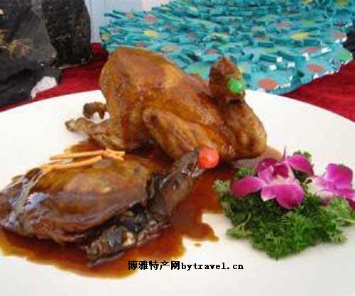 当地人用甲鱼作成一道道风味独特的地方名菜。用甲鱼和鸡为原料制作的名菜“霸王别姬”,色鲜味美,营养丰富。