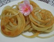 简介: “一窝丝”又叫“盘丝饼”,是山西省忻州地区宁武县的特色小吃,历史悠久,曾经是高级宴席的甜点。“一窝丝”以酥、脆、香为贵,具有色淡黄,味甘甜,质酥脆的特色。鲜食时甜绵可口,干食时酥脆清香。其形状像曲蜷待腾的蛟龙,提起一根线,放下一窝丝,动一动,散成一堆;嚼一嚼,其味无比。存放一至两月,色、味不变,软硬程度不变。后来,随着人们生活的富裕程度日益提高,白面、胡麻油家家不缺,“一窝丝”在全县农村兴盛起来,成为人们迎宾待客的佳品。