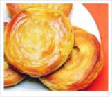 从十斤面中取出三两,和食盐、油拌成稀酥子,再用1.7斤起成起面,剩下的面用温开水和得稍硬些,加入起面和匀,撒上碱揉匀,滚成细条,撕成25块,每手各拿一块推开,把酥子抹上卷起来,用手包成圆形,用刀把周围旋开,按扁擀成圆形,鏊子烫起手时,放在周围,烫住皮后,用刀从中切开,翻转再烫一会儿,面向里下炉烤到五成熟,翻转再烤一会儿即成。【特点】