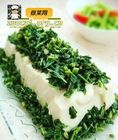 3.将姜末、蒜末、盐、香椿芽末一起撒在豆腐上面稍腌一会儿。淋上芝麻油,爱吃辣的,撒上红辣椒末。